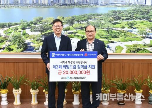 케이부동산뉴스 김교민 기자 | 수원시 영통구는 지난 12일 동수원새마을금고에서 관내 초‧중‧고등학생 56명을 위한“제2회 희망드림 장학금” 2,000만 원을 영통구에 기탁했다고 밝혔다.
