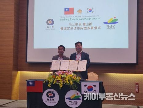 케이부동산뉴스 김교민 기자 | 예산군은 10월 25일 대만 타이둥현 지상향에 위치한 파파고리조트에서 우호교류 협약식을 진행했다. 이번 협약식을 위해 예산군수, 기획실장 등 군관계자들이 대만에 직접 방문했고, 대만 외교부 집행장, 슬로시티 총회장 등 관련된 많은 이들이 방문단 환영과 우호교류 협약을 축하하기 위해 참석했다.