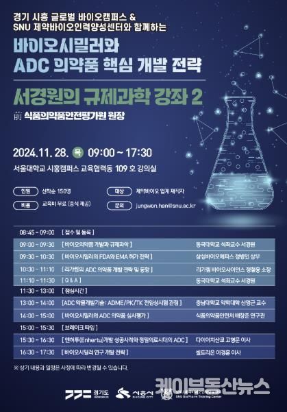 케이부동산뉴스 김교민 기자 | 시흥시는 오는 28일 서울대학교 시흥캠퍼스 교육협력동에서 제약바이오 업계 재직자와 관계기관 재직자 약 200명을 대상으로 ‘규제과학 강좌2’를 개최한다.