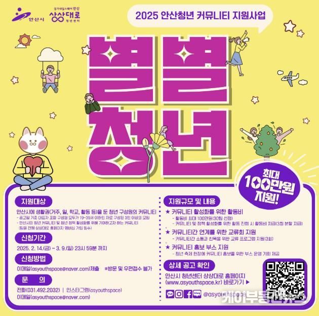케이부동산뉴스 김교민 기자 | 안산시는 청년 네트워킹을 위한 커뮤니티 지원사업인 ‘별별청년’ 참여팀을 모집한다고 21일 밝혔다.