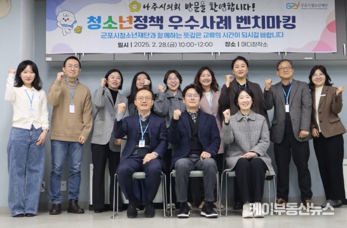 케이부동산뉴스 김교민 기자 | 군포시청소년재단은 나주시의회 청소년 정책연구회 방문단을 맞아 2025년 2월 28일 군포시청소년재단에서 환영 행사를 진행했다. 이번 방문은 청소년 정책 및 사업 운영과 관련한 정보 교류와 우수 사례 공유를 목적으로 이루어졌으며, 나주시의회 소속 의원 및 주무관, 미래교육센터 팀장이 참석했다.