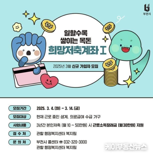 케이부동산뉴스 김교민 기자 | 부천시는 오는 3월 14일까지 일하는 생계·의료급여 수급 가구를 대상으로 ‘희망저축계좌(I)’ 신규 가입자를 모집한다.