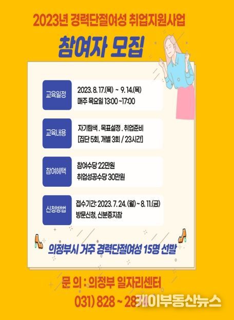 케이부동산뉴스 김교민 기자 | 의정부시는 구직자를 위한 재취업 지원사업으로‘경력단절여성 취업지원사업’ 참여 대상자를 7월 24일부터 8월 11일까지 모집한다.