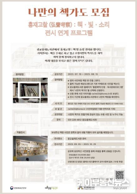 케이부동산뉴스 | 수원시 광교홍재도서관이 ‘홍재고찰(弘齋考察):책‧빛‧소리’ 연계 프로그램인 ‘나만의 책가도1) ’ 참여자를 8월 15일까지 모집한다.