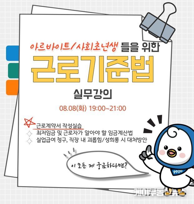 케이부동산뉴스 | 파주시는 8월 4일까지 기초 노동법 강의에 참여할 청년(만 19~34세) 16명을 선착순으로 모집한다.
