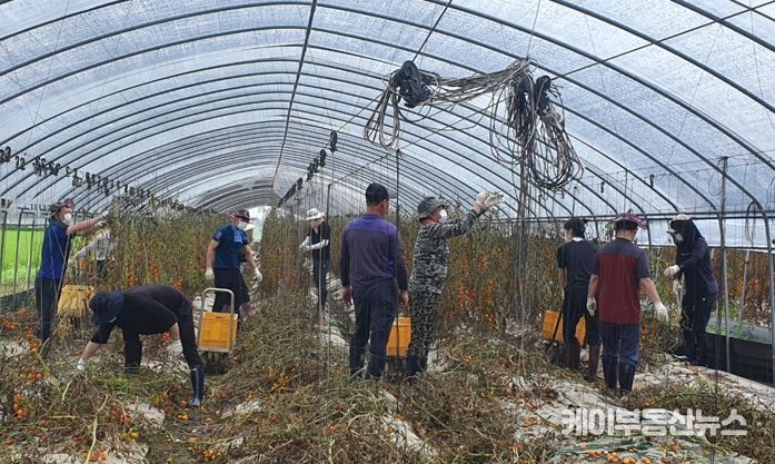 이들은 침수 피해로 수확을 포기해야 하는 오이와 토마토, 멜론 등 시설채소 작물과 비닐을 제거하고 작업장 정리 정돈을 돕는 등 시름에 빠져있는 농가의 어려움을 조금이나마 덜어주기 위해 구슬땀을 흘렸다.