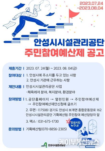 케이부동산뉴스 | 안성시시설관리공단은 7월 24일부터 8월 4일까지 2주간 안성 주민을 대상으로 주민참여예산제를 진행한다고 밝혔다.