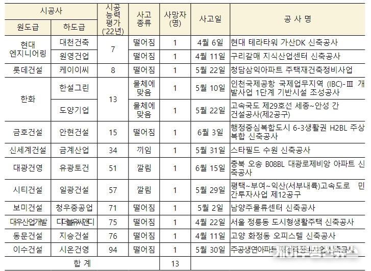이 중 100대 건설사 현장에서 발생한 사망자는 11개사 13명으로, 전년 동기 대비 3명 증가했으며, 한화, 현대엔지니어링에서 각 2명씩, 그 외 9개 사에서 각 1명씩 사망자가 발생했다.
