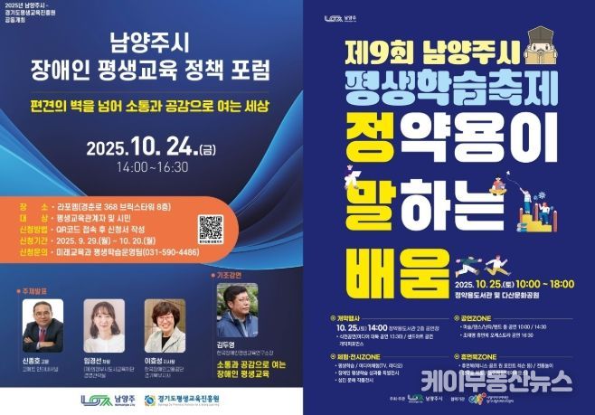 케이부동산뉴스 김교민 기자 | 남양주시는 장애인과 비장애인이 함께 어우러지는 평생학습 환경 조성과 모두를 위한 평생학습 가치공유 및 활성화를 위해 오는 24일 ‘장애인 평생학습포럼’, 25일 ‘평생학습축제’를 연이어 개최한다고 밝혔다.
