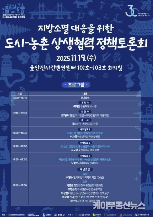 수원특례시(시장 이재준)는 11월 19일 오후 4시 울산전시컨벤션센터 1층에서 ‘지방소멸 대응을 위한 도시–농촌 상생협력 정책토론회’를 개최한다.