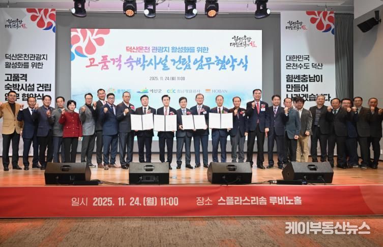 케이부동산뉴스 김교민 기자 | 예산군은 24일 충청남도, 충남개발공사, ㈜호반호텔앤리조트와 함께 덕산온천관광지에 고품격 숙박시설 및 컨벤션 기능을 갖춘 복합 휴양시설 건립을 위한 업무협약(MOU)을 체결했다.