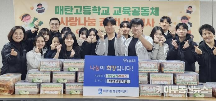 케이부동산뉴스 김교민 기자 | 매탄고등학교는 지난 19일, 교사·학생·학부모가 함께 참여해 마련한 김장김치 26박스를 매탄3동행정복지센터에 전달하며 지역사회에 따뜻한 나눔을 실천했다.