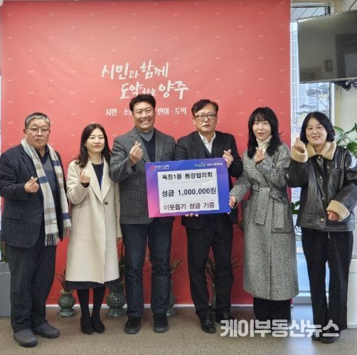 케이부동산뉴스 김교민 기자 | 옥정1동 통장협의회가 31일 지역 내 어려운 이웃을 돕기 위해 ‘이웃돕기 성금 100만 원’을 옥정1동에 기부했다. 기부금은 관내 취약계층과 복지 사각지대 가정 지원을 위해 사용될 예정이다.