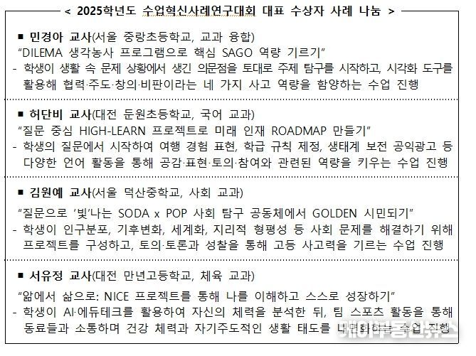 이번 시상식은 지속적인 연구로 수업 혁신을 이끌어 온 교사들의 노력을 알리고, 수업 경험을 공유하며 우수 수업사례를 전국적으로 홍보・확산하기 위해 마련됐다.