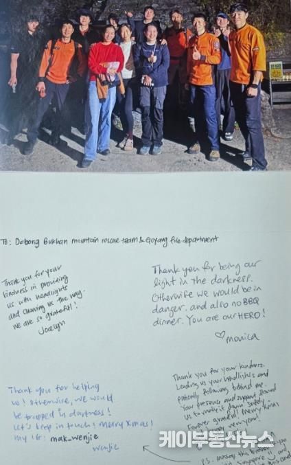 케이부동산뉴스 김교민 기자 | 경기도 구조대원의 활동으로 자칫 생명을 잃을 수도 있는 상황에서 위기를 넘긴 외국인 관광객이 감사 편지를 보낸 사실이 알려져 화제다. 화제의 주인공들은 고양소방서 산악구조대.