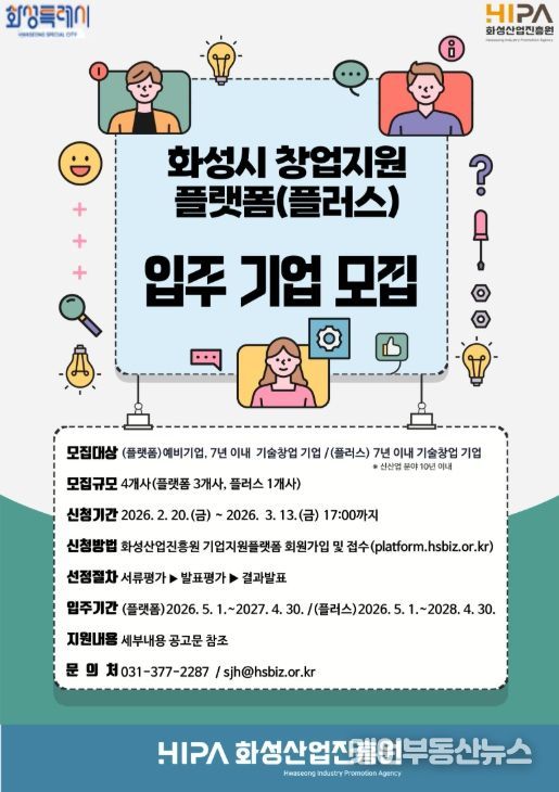 케이부동산뉴스 김교민 기자 | 화성산업진흥원(원장 전병선)은 동탄2 인큐베이팅센터 내 창업보육센터 ‘창업지원플랫폼’과‘창업지원플랫폼 플러스’ 입주기업을 오는 3월 13일까지 모집한다고 밝혔다.
