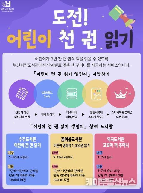 케이부동산뉴스 김교민 기자 | 부천시는 어린이의 체계적인 독서 습관 형성과 도서관 이용 활성화를 위해 기존 수주도서관 중심으로 운영하던 ‘어린이 천 권 읽기 챌린지’를 꿈여울도서관과 역곡도서관까지 확대 운영한다.