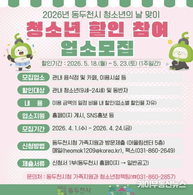 케이부동산뉴스 김교민 기자 | 동두천시는 오는 5월 청소년의 날을 맞이하여 청소년 복지를 증진하고 지역경제를 활성화하기 위해 오는 5월 18일부터 5월 23일까지 6일간 ‘청소년 할인 주간’을 운영한다.