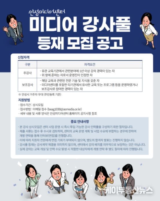 케이부동산뉴스 김교민 기자 | 안성시는 4월 1일부터 보다 체계적이고 전문적인 미디어 교육 운영을 위해 ‘미디어 강사풀’ 등재 강사를 상시 모집한다.