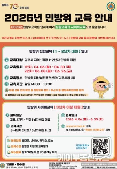 케이부동산뉴스 김교민 기자 | 김포시는 2026년 상반기 민방위 대원의 안보 의식 고취와 재난 대응 역량 강화를 위해 ‘2026년 상반기 민방위 교육’을 본격적으로 시행한다고 밝혔다. 이번 교육은 민방위 대원의 연차에 따라 집합교육과 사이버교육으로 구분되어 진행되며, 특히 올해는 연차별 일정을 세분화해 운영한다.