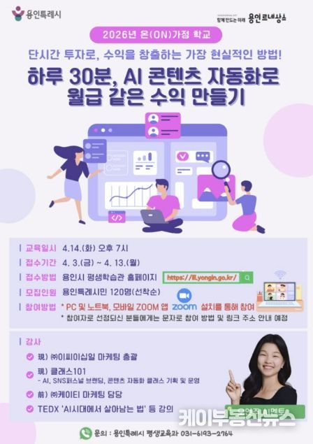 케이부동산뉴스 김교민 기자 | 용인특례시는 오는 13일까지 ‘하루 20분, AI 콘텐츠 자동화로 월급 같은 수익 만들기’를 주제로 한 ‘2026년 온가정학교’ 온라인 특강 수강생을 모집한다고 3일 밝혔다.