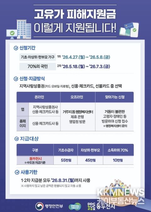 KKMNEWS 김교민 기자 | 동두천시가 중동발 고유가와 고물가로 인한 시민 부담을 완화하고 지역경제 회복을 지원하기 위해 ‘고유가 피해지원금’을 지급한다.