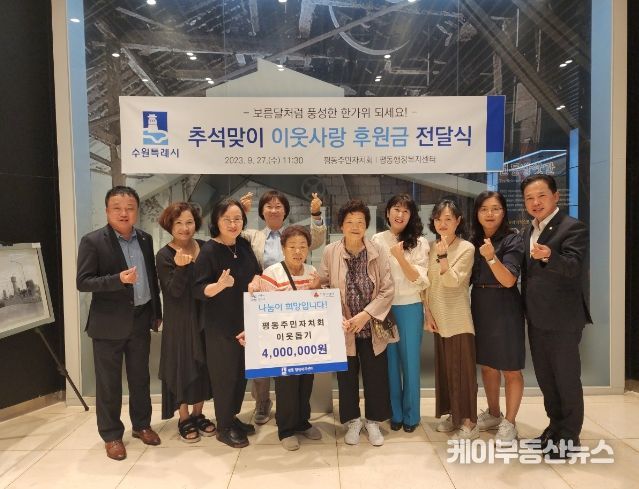 케이부동산뉴스 김교민 기자 | 권선구 평동 주민자치회는 지난 27일 추석 명절을 맞이하여 관내 어려운 이웃을 위한 성금 400만원을 기탁했다고 밝혔다.