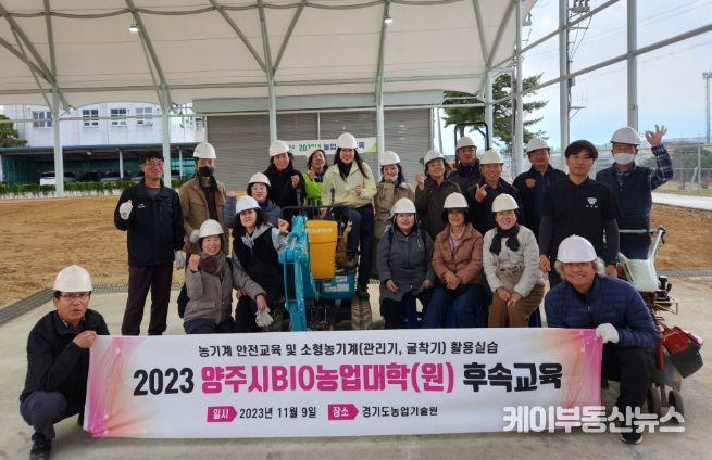 케이부동산뉴스 김교민 기자 | 양주시는 지난 9일 경기도농업기술원 교육센터에서 2023년 BIO농업대학(원) 졸업생 18명이 참석한 가운데 농기계 안전 사용 및 소형농기계(관리기, 굴착기) 실습 교육을 추진했다.