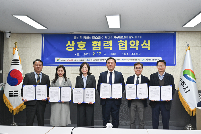 2월 17일(금) 여주시(시장 이충우)는 숲가꾸기를 통해 기후변화 위기에 대응하기 위해 한국코카-콜라, WWF-Korea(세계자연기금), 한국수자원공사 한강유역본부, 한국생태환경연구소, 여주시산림조합과 “물순환 강화와 탄소흡수 확대로 지구온난화 방지를 위한 상호 협력 협약서” 업무협약식을 체결했다.