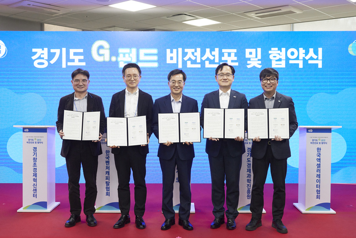 김동연 지사는 23일 성남 판교 경기스타트업캠퍼스 창업라운지에서 강성천 경기도경제과학진흥원장, 신현삼 경기창조경제혁신센터장, 윤건수 한국벤처캐피탈협회장, 신진오 한국액셀러레이터협회장과 ‘경기도 G-펀드 비전선포 및 협약식’을 열었다.