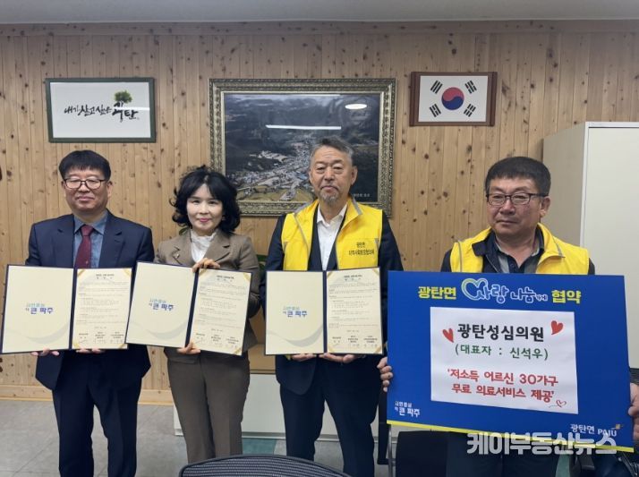 케이부동산뉴스 김교민 기자 | 파주시 광탄면은 16일, 광탄면 지역사회보장협의체, 광탄성심의원과 저소득 어르신을 대상으로 무료 의료서비스를 지원하는 협약식을 개최했다.