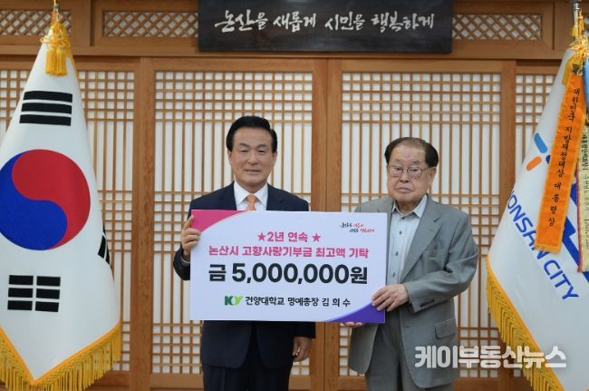 케이부동산뉴스 김교민 기자 | 지난 19일, 건양대학교 설립자 겸 명예총장인 김희수 박사가 2년 연속‘고향사랑기부제’최고액인 500만 원을 고향 논산시에 기부하며 남다른 고향사랑을 실천했다.