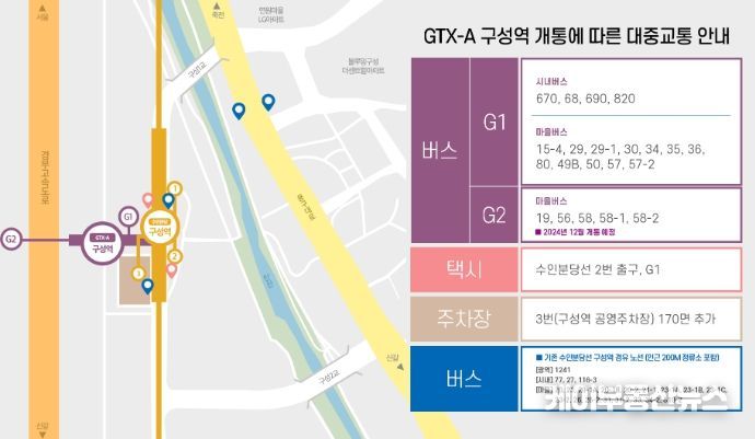 시는 기존에 운행하는 노선들 가운데 시내버스 4개 노선(670, 68, 690, 820)과 마을버스 12개 노선(15-4, 29, 29-1, 30, 34, 35, 36, 80, 49B, 50, 57, 57-2번) 등 16개 노선버스가 GTX-A 구성역 1번 출구를 경유하도록 순차적으로 경로를 바꿔 나갈 계획이다.