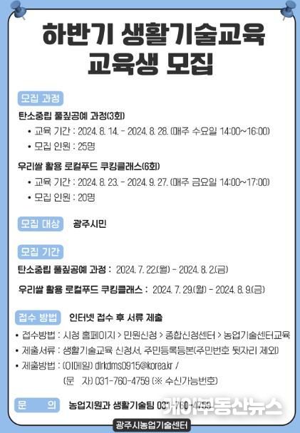 교육 대상은 광주시민으로 교육 신청은 광주시청 홈페이지를 통해 온라인 접수(민원신청'종합신청센터'농업기술센터교육)로 가능하다.