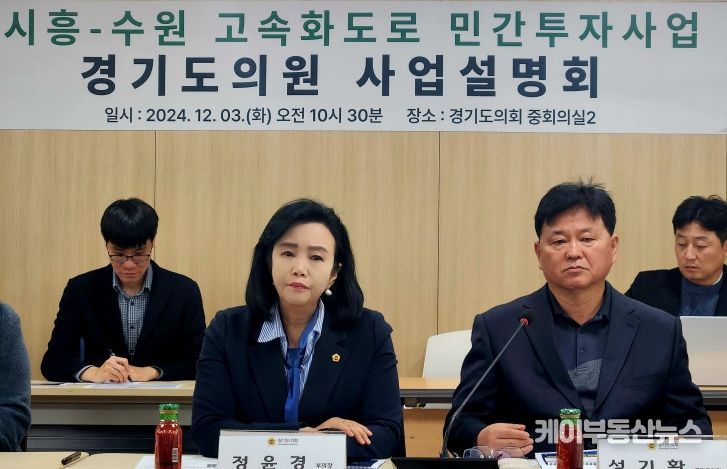 케이부동산뉴스 김교민 기자 | 경기도의회 부의장 정윤경(더불어민주당, 군포1) 도의원이 3일 경기도의회 중회의실에서 도의원 대상으로 열린 ‘시흥-수원 고속화도로 민간투자사업 사업설명회’에 참석해 고속화도로 건설에 대한 경기도청과 군포시의 의견을 청취했다.