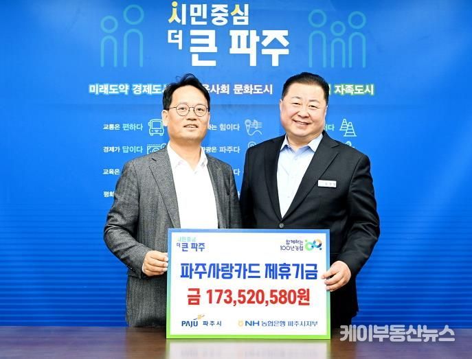케이부동산뉴스 김교민 기자 | 파주시는 지난 19일 엔에이치(NH)농협은행 파주시지부로부터 지난해 적립된 제휴카드 적립기금 1억 7,352만 580원을 전달받았다고 밝혔다.