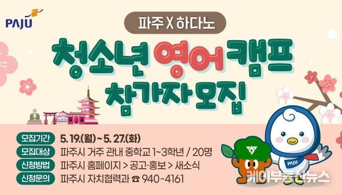 모집 대상은 파주시 관내에 거주하고 관내 중학교에 재학 중인 1~3학년 청소년이며, 신청 기간은 5월 19일부터 27일까지다. 참가자는 1차 서류 심사 후 2차 면접 심사를 거쳐 선정되며, 선발된 청소년에게는 영어캠프 참가비 일부와 일본 왕복 항공료 일부가 지원된다.