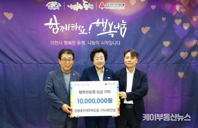 케이부동산뉴스 김교민 기자 | 지난 4일, 이천시는 안흥동지역주택조합과 ㈜서희건설이 지역사회 상생을 위한 따뜻한 나눔 실천으로 총 1천만 원을 기부했다고 밝혔다.