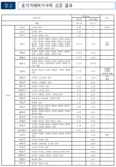 이 중 해당 시장·군수가 투기 우려가 없다며 허가구역 해제를 요청한 임야 91㎢와 재산권 행사에 불편을 겪었던 고양시 덕양구 재개발․재건축 사업구역(0.7㎢)은 7월 4일부터 허가구역에서 해제된다. 나머지 시흥시 등 21개 시군 임야 일부(120㎢)는 기획부동산에 의한 투기행위가 이어지고 있는 점을 고려해 1년 연장이 결정됐다.