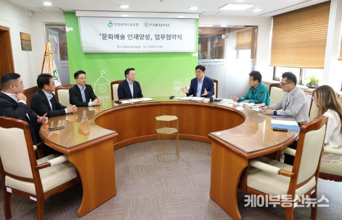 케이부동산뉴스 김교민 기자 | 인천광역시교육청은 18일 ㈜파라다이스와 인천지역 문화예술 인재 양성을 위한 업무협약을 체결했다.