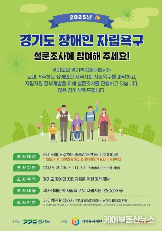 케이부동산뉴스 김교민 기자 | 경기도와 경기복지재단, ㈜한국리서치가 26일부터 10월까지 도내 재가 중증장애인 1천 명을 대상으로 자립 욕구 파악을 위한 설문조사를 실시한다.