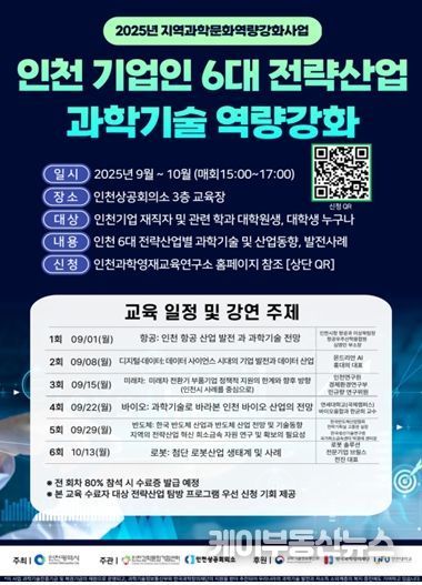 케이부동산뉴스 김교민 기자 | 인천광역시는 지역 전략산업을 주제로 한 6대 전략산업 과학기술 역량강화 과정을 개설하고 참가자를 모집한다고 밝혔다.