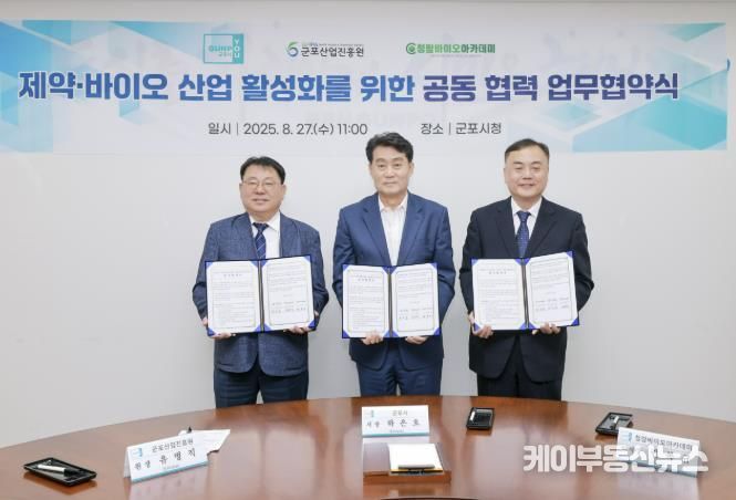 케이부동산뉴스 김교민 기자 | 군포시는 8월 27일 시청 회의실에서 군포산업진흥원, 청람바이오아카데미와 제약·바이오·헬스케어 산업 활성화 및 지역 인재 양성을 위한 3자 업무협약을 체결했다.