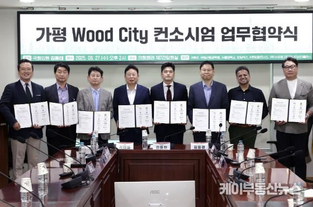 가평군은 27일 국회에서 김용태 의원, 국립산림과학원, 서울대학교 산림과학부 등과 함께 ‘가평 우드시티(Wood City) 컨소시엄’ 업무협약을 체결했다. 이번 협약에는 산림녹화 및 목재 전문기업 수프로와 유니드플러스, 국제 펀딩기관 펀딩박스(FundingBox), 케이펀딩파트너스가 참여했다.