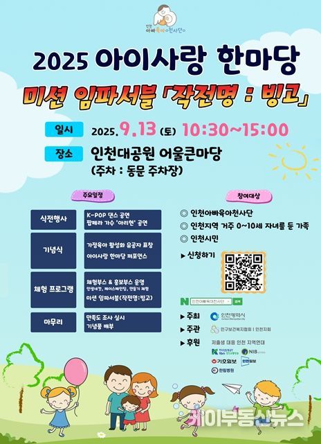 케이부동산뉴스 김교민 기자 | 인천광역시는 인천시와 인구보건복지협회 인천지회가 공동 운영하는 인천아빠육아천사단이 주관하는 ‘2025 아이사랑 한마당, 미션 임파서블’ 행사가 오는 9월 13일 오전 10시 30분부터 오후 3시까지 인천대공원 어울큰마당에서 열린다고 밝혔다.