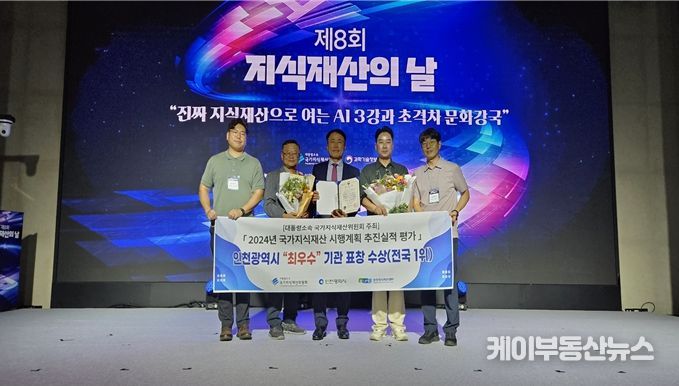 케이부동산뉴스 김교민 기자 | 인천광역시는 대통령소속 국가지식재산위원회 주최로 9월 4일 서울 양재 L타워에서 열린 ‘제8회 지식재산의 날’ 기념식에서 광역지자체 부문 최우수기관으로 선정되어 국가지식재산위원회 위원장 기관표창을 수상했다고 밝혔다.