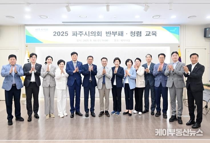 케이부동산뉴스 김교민 기자 | 파주시의회는 9월 10일 의회 세미나실에서 전 의원과 사무국 직원을 대상으로 반부패‧청렴 교육을 실시했다. 이번 교육은 의회의 청렴성을 제고하고 청렴한 의정활동을 실천하기 위해 마련됐다.