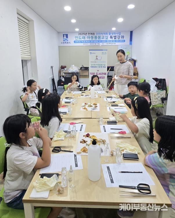 케이부동산뉴스 김교민 기자 | 수원시 팔달구 인계동 주민자치회는 9월 16일 인도래작은도서관에서 '인도래 아동돌봄 교실' 제8강 드라이플라워 디퓨저 만들기 수업을 진행했다.