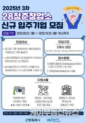 케이부동산뉴스 김교민 기자 | 고양특례시가 조성하고 고양산업진흥원이 운영하는 ‘28청춘창업소’가 10월 20일까지 3차 신규 입주기업을 모집한다.