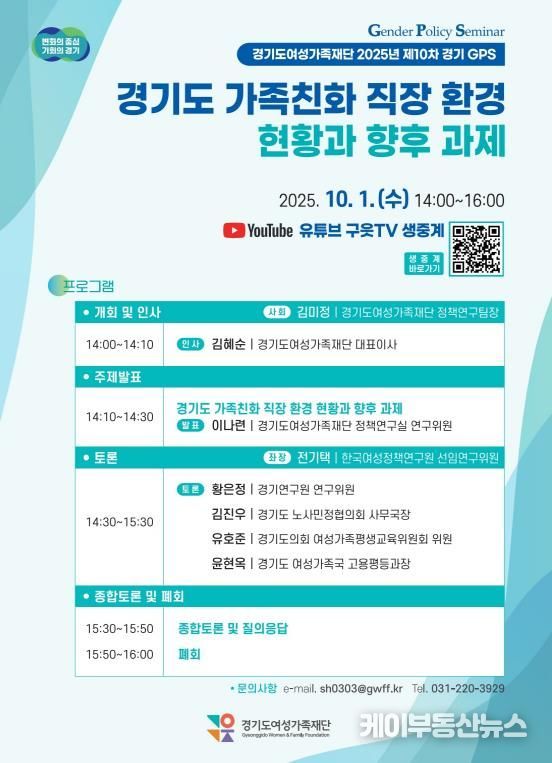 케이부동산뉴스 김교민 기자 | 경기도여성가족재단이 10월 1일 오후 2시 ‘경기도 가족친화 직장환경 현황과 향후 과제’를 주제로 정책토론회를 개최한다.